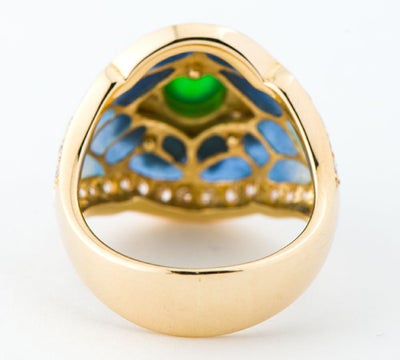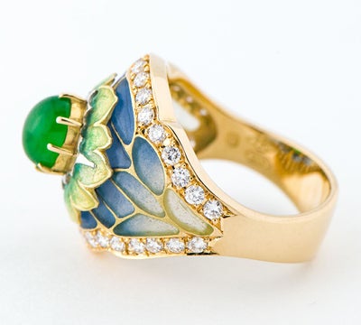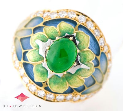 エマイユ技法を用いて独特の世界観を魅せる中嶋邦夫のニックスファクトリー。上質な翡翠をメインに使用。とろけそうなみずみずしい美しさを放つ翡翠とマットな質感の寒色系エマイユ。18金の艶やかなゴールドと縁を飾るダイヤモンドのコントラスト。絵画を思わせる美しい指輪です。