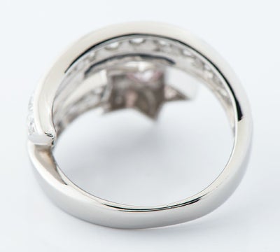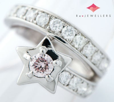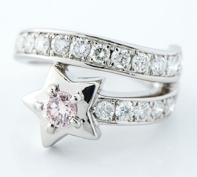 稀少なFANCY LIGHT PINKカラーのダイヤモンド0.380ctをセットしたリング。VS1と透明度も申し分なく、広い場面から放たれる煌めきが存在感を放ちます。メレダイヤモンドも大きめのサイズのものを使用し、地金をしっかりと使った程よい重厚感のある作りが特徴的です。ポップなデザインに上質な素材を組み合わせた洗練されたジュエリーです。
