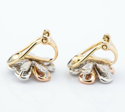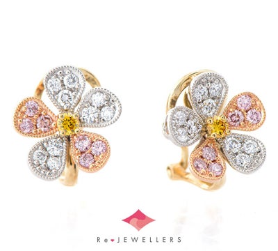 特徴 ナチュラルカラーダイヤモンドを使った贅沢なイヤリング。可愛らしい小花のデザインは、花弁に稀少なピンクダイヤモンドをセット。中央には濃くビビッドなイエローカラーダイヤモンドをあしらい、石の色に合わせ、プラチナ、イエロー、ピンクゴールドの留め爪を使用しています。ミル打ち風の装飾で、上品な仕上がりに。普段使いもしやすい、程よいサイズも魅力的な美しいジュエリーです。