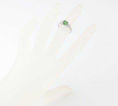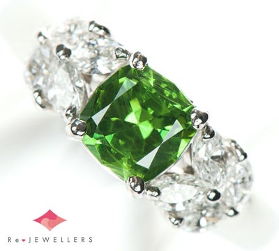 深い黄緑色に鮮やかな色合いが目を引く、デマントイドガーネット0.79ctのリング。ロシアやヨーロッパでは幸運の象徴とされたインクルージョン、ホーステールをルーペで確認することができます。存在感を放つ個性的なクッションシェイプにマーキスブリリアントダイヤモンドをあしらい、エレガントに仕上げています。あらゆるシーンで楽しむことのできる、華やかで魅力的なジュエリーです。