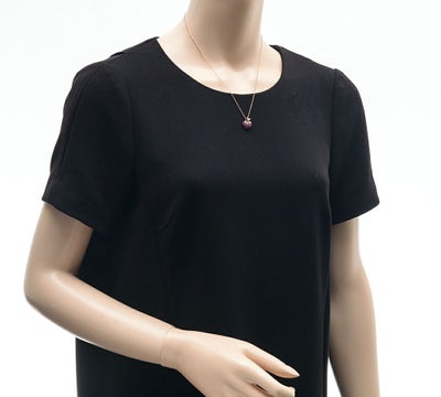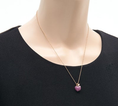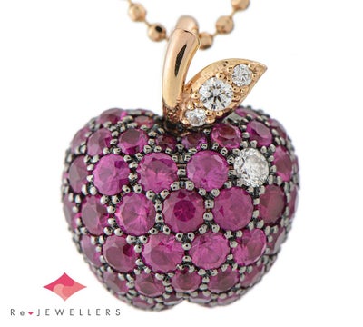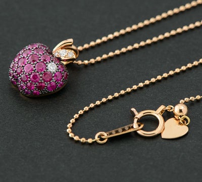 肌ざわりの滑らかさから丁寧なつくりがうかがえる、リンゴをモチーフにしたペンダントネックレスです。赤橙色のルビーとブラックコーティングされた留め爪のシックな色の組み合わせ、艶めきをダイヤモンドで表現するところ、種に見立てたブルーサファイアをあしらった断面にマットなピンクゴールドを選ぶなど、一つ一つのディテールにこだわりが感じられます。ルビーの色の美しさが引き立つ、小ぶりで使い勝手の良いジュエリーです。