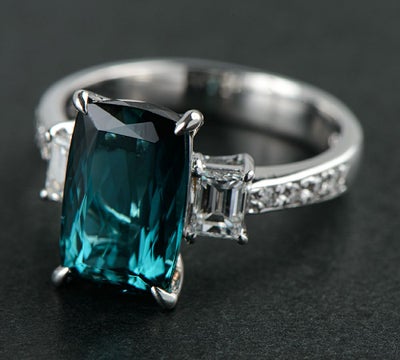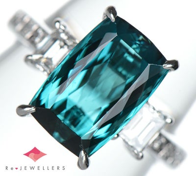 品質コメント:グリーンを帯びたブルーカラー。ルーペでパビリオン(石の下部)に内包物を研磨した際にできた凹みを確認できますが、他に目立つ内包物もあまりなく、透明度もテリの良さも大変優れた高品質なものがセレクトされています。
