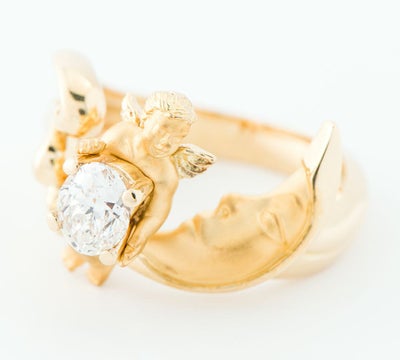 特徴 ベルギー、スペイン王室やハリウッドセレブ達をも魅了したスペインの老舗宝飾ブランド カレライカレラのリングです。波間に漂うマットゴールドの三日月に佇む天使。その天使が抱えるオーバルブリリアントカットダイヤモンド 0.617ctの美しさを引き出す、造形美は他では見られない唯一無二の魅力を放ちます。宝飾品という域を超え、身に着ける芸術作品といえるジュエリーです。