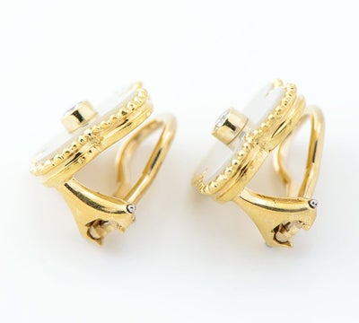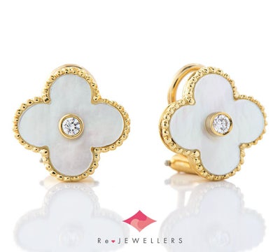 特徴 ヴァンクリーフ&アーペルでは定番となったアルハンブラのイヤリングです。シンプルなデザインですが、飽きの来ないスタイル。フェミニンな装いにもカジュアルな装いにもどちらにもマッチします。ゴールドとシェルが放つ干渉色のコントラストの中に、ポイントとしてセットされたダイヤモンドが光ります。引きの美学の真骨頂ともいえる美しいヴィンテージアルハンブラです。※NY刻印有