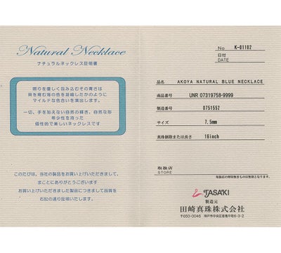 特徴 創業以来、自社の厳しい評価基準により真珠を選定している田崎。柔らかなグレー系のカラーが美しい、アコヤ真珠をセットしたネックレスです。主張しすぎず、上品な7.5-8.0mmで、テリの良い干渉色の美しいものがセレクトされています。ホワイト系の真珠とはまた違った落ち着いたエレガンスを感じさせるジュエリーです。※保証書にNATURAL BLUE(ナチュラルブルー)の記載が有ります
