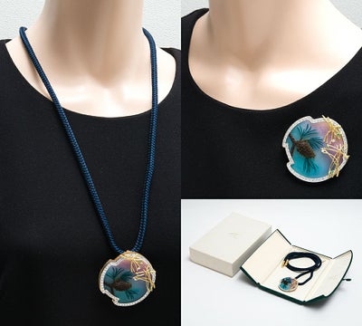 独特の色合いと質感を生み出すガラス工芸技法、パート・ド・ヴェールという技術を取り入れたブローチ兼ペンダントトップ。朝焼けの空を思わせるような美しいグラデーションに松が描かれており、中嶋邦夫らしい美の世界を閉じ込めています。