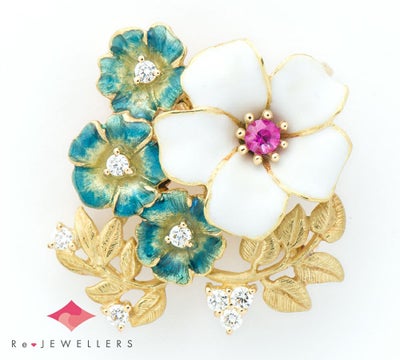 エマイユ技法を用いて独特の世界観を魅せる中嶋邦夫のニックスファクトリー。濃密なピンクサファイアの花芯を持つ、大ぶりな白い花びらが印象的なブローチ兼ペンダントトップです。模様が浮き出るような技法のグリーンの可憐な花の美しいグラデーション、艶消ししたゴールドのマットな質感の葉がエマイユの魅力とマッチして、中嶋邦夫が愛する素朴な自然の中に息づく美しさを感じさせる作品に仕上がっています。※中嶋 邦夫著書「In the garden」134ページに掲載有
