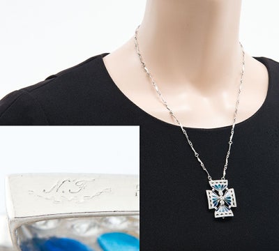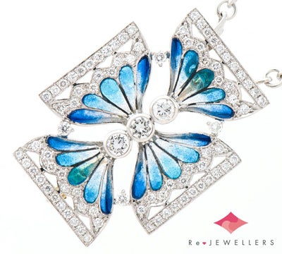特徴 エマイユ技法を用いて独特の世界観を魅せる中嶋邦夫 ニックスファクトリーのペンダント ネックレス。エレガントで上品なデザインと、ブルーのエナメルの繊細なグラデーションがマッチしています。中央の3石のダイヤモンドは計0.51ctと存在感があり、装飾部分にあしらわれたメレダイヤモンドが華やかさを演出。トップは取り外して、ブローチとして使うこともできます。気品漂う、芸術的なジュエリーです。