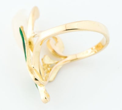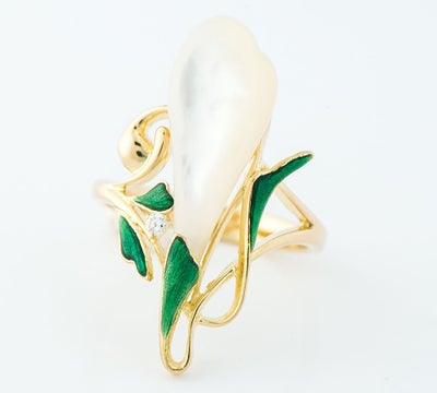 特徴 エマイユ技法を用いて独特の世界観を魅せる中嶋邦夫のニックスファクトリー。地金部分に繊細な彫金模様を施し、模様が浮き出るよう釉薬を載せて焼き付ける技法で鮮やかなグリーンの葉を表現しています。つぼみの白百合を白蝶貝の光沢を効果的に使し表現。動くたびに美しく艶めきます。朝露のように煌めく1石のダイヤモンド、伸びやかな美しいデザインからも瑞々しさが伝わります。初期にデザインされた作品で、素朴なモチーフを芸術的に仕上げた個性的なジュエリーです。
