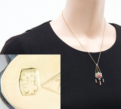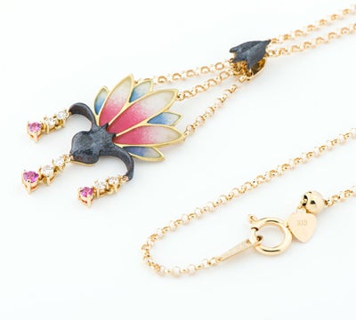 特徴 エマイユ技法を用いて独特の世界観を魅せる中嶋邦夫。繊細で優美なジュエリーをコンセプトとしたIn The Gardenコレクションのロータス ペンダント・ネックレスです。ゆらゆらと揺れるピンクサファイアとダイヤモンド、エキゾチックな色遣いが優美な印象を与えます。シックな黒が、全体を引き締めるデザインのポイントに。芸術性を感じる個性的なジュエリーです。