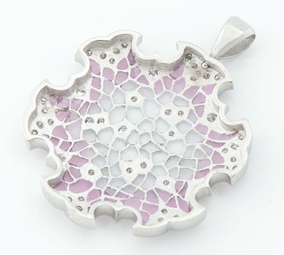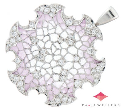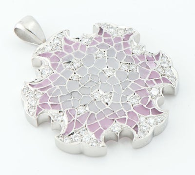 特徴 エマイユ技法を用いて独特の世界観を魅せる中嶋邦夫。数々の作品の中でも異彩を放つ、抽象的でモダンなデザインのペンダントトップです。モザイク模様は美しいピンクから始まり、中央に向かうにつれ向こう側がうっすら透けて見えるすりガラスのような透明感のあるエナメルが施されています。和のモチーフ、雪輪を美しく表現した芸術的なジュエリーです。