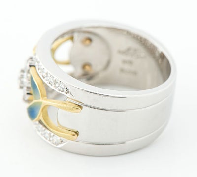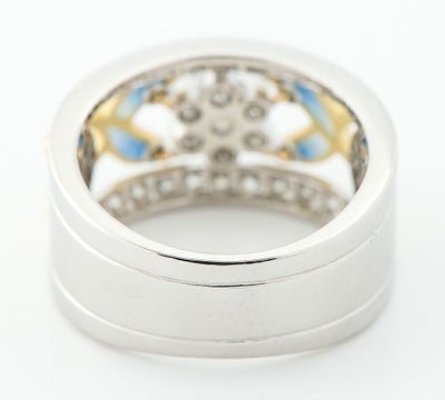 特徴 エマイユ技法を用いて独特の世界観を魅せる中嶋邦夫のニックスファクトリー。艶消しゴールドと繊細なエマイユの色使いが上品な印象を与えるリングです。花のようにセットされた中央のダイヤモンドと、上下のラインが煌びやかさをプラス。程よい幅があるため、ボリューム感があり重厚感のあるデザインに仕上げています。唯一無二の感性が光る、芸術的なジュエリーです。