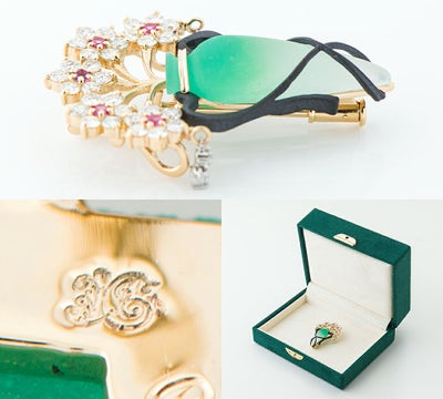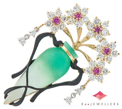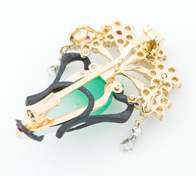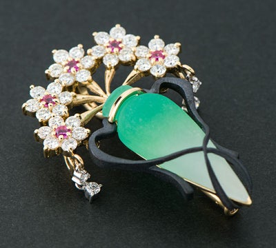 独特の色合いと質感を生み出すガラス工芸技法、パート・ド・ヴェールという技術を取り入れたフラワーベースモチーフのブローチ兼ペンダントトップ。すりガラスのマットな風合いと、グリーンのグラデーションに目を奪われます。黒色の赤銅がデザインのアクセントになっており、生き生きと咲く5輪の花は、中央のピンクサファイアがポイントに。ゆらゆらと揺れるダイヤモンドで動きを出した芸術的ジュエリーです。