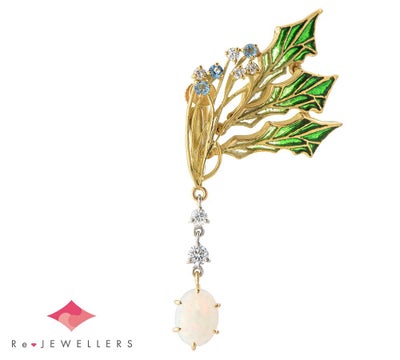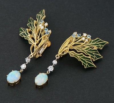 特徴 日本におけるエマイユ(七宝)ジュエリーの第一人者として高い評価を受けている、中嶋邦夫 ニックスファクトリー。緑のプリカジュール・エナメルで生き生きと表現された葉が、目を引きます。先端には、鮮やかなオレンジやグリーンのプレイ・オブ・カラーを楽しむことのできるオパールをセット。ゆらゆらと揺れる姿が印象的な、存在感のあるジュエリーです。