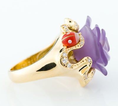 特徴 宝石の中に宝石を象嵌する高度なオリジナル技術「石嵌」で知られる日本のブランドAKコレクション。自然の中に生きる小さな逞しい命をジュエリーで表現するジュエラー 金澤郁乃のリングです。艶やかな大輪の花の様子をうかがうように、傍らにちょこんと乗った姿がとても可愛らしいてんとう虫。高い技術が詰め込まれているてんとう虫と紫色に艶めく花の周りをダイヤモンドの煌めきで華やかに引き立てるデザインは、自然の一部が活き活きと表現された作品です。指通りも滑らかで、大きなモチーフも指にフィットするように作られています。※紫色石は表面加工上、特定するためのデータを検出できないため石名は記載しておりません。あらかじめご了承くださいませ。