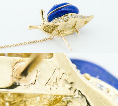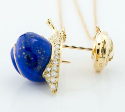 特徴 宝石の中に宝石を象嵌する高度なオリジナル技術「石嵌」で知られる日本のブランドAKコレクション。自然の中に生きる小さな逞しい命をジュエリーで表現するジュエラー 金澤郁乃のカタツムリモチーフのタイタックです。滑らかにパヴェセッティングされたダイヤモンドの輝きに圧倒されます。背中に背負った可愛らしいラピスラズリは、金箔のような石の模様とゴールドの曲線がポイントに。遊び心と実用性のバランスが素晴らしい、趣向を凝らしたチャーミングなジュエリーです。