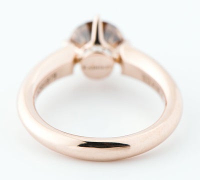 肌馴染みの良いオリジナルカラーゴールドに、ブラウンダイヤモンドが上品にマッチしたカシケイソリティアのリング。ディープなブラウンカラーが美しい1.14ctの上質なものがセットされており、一目で伝わるテリの良さが魅力です。少し傾けるだけで、ありとあらゆる光を反射し放たれる眩い煌めき。色の深さによりその輝きが、より一層引き立ちます。無駄のないシンプルなアームと、石座部分にセットされたポイントのメレダイヤモンドが洗練された雰囲気。ブラウンダイヤモンドの素晴らしさを存分に味わえる、ハイジュエリーです。