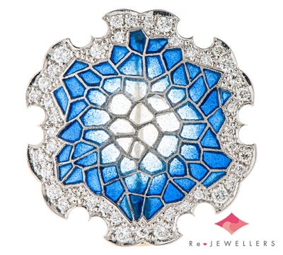 特徴 エマイユ技法を用いて独特の世界観を魅せる中嶋邦夫。数々の作品の中でも異彩を放つ、抽象的でモダンなデザインのペンダントトップです。モザイク模様は美しい濃い青色から始まり、中央に向かうにつれ向こう側がうっすら透けて見えるすりガラスのような透明感のあるエナメルが施されています。背景によって青色の濃淡が印象を変える和のモチーフ、雪輪を美しく表現した芸術的なジュエリーです。