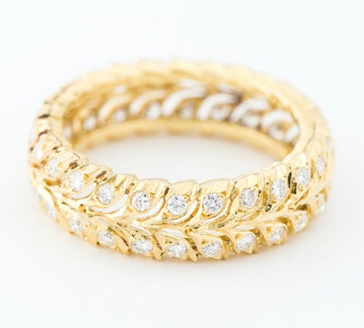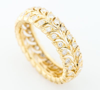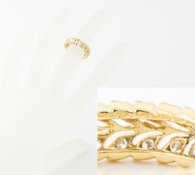 特徴 イタリア・ルネッサンスの伝統を受け継ぎながら独創的な作品で世界の人々を魅了し続けるジャンマリア・ブチェラッティ。金細工に施された独特の質感が目を引くエターナルリングです。ボタニカルを思わせる繊細なテクスチャーにダイヤモンドが施され、軽さのあるエターナルに仕上げる技術力の高さに驚きを隠せません。側面に施された手彫りならではの上品な光沢もデザインにマッチした気品溢れるジュエリーです。