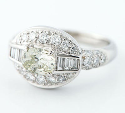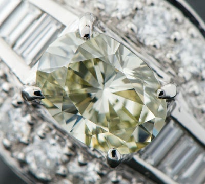 個性が光るモダンなデザインが洗練されたイメージを与える、稀少なナチュラルカラーダイヤモンドのリング。グレーを帯びた淡いグリーンイエローカラーで、0.85ctアップの広い場面から放たれる透明感のある煌めきが目を引きます。サイドはステップカット、上下はラウンドブリリアントと異なる形のダイヤモンドを使い、バランスよく華やかに仕上げています。幅広い装いに合わせていただける、存在感のあるジュエリーです。