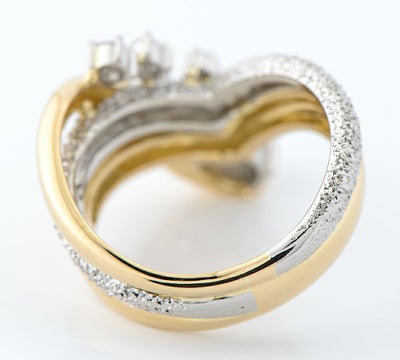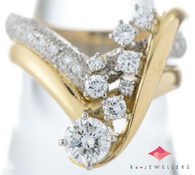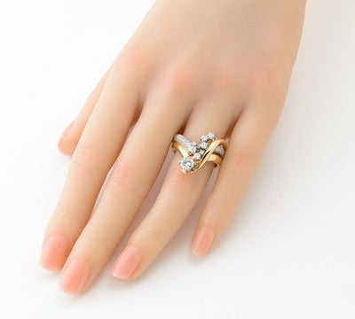 日本の美意識と品格が奥底に流れる独得の世界観で多彩なデザイン展開を見せる石川暢子。指元を美しく見せるV字デザインは、イエローゴールドとプラチナの組み合わせがラグジュアリーな印象を与えます。流れるように贅沢に散りばめられたダイヤモンドと個性的なプラチナのテクスチャーが相まって華やか。V字の先端にセットした上質な0.5ctアップのダイヤモンドが、眩い煌めきを放ちます。